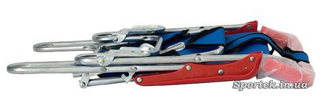 Крісло виготовлено з алюмінієвої трубки з червоними пластмасовими ручками. Сидіння і спинка виконані з синьою синтетичної тканини.