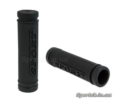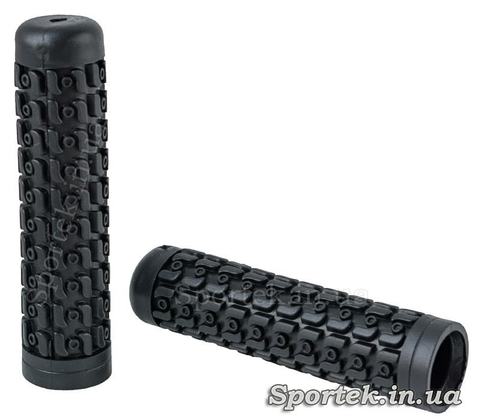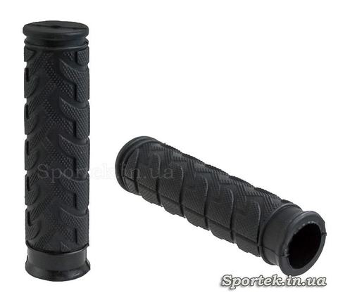 Грипсы черного цвета из мягкой резины ровной цилиндрической формы с противоскользящим рисунком.