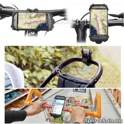 Підійде так само для кріплення смартфонів на ручці дитячої коляски або тачки в супермаркеті, на кермі мотоцикла або скутера.