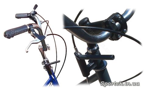 Дуже зручною особливістю для управління трьохколісними велосипедами у всіх наших моделей є доводчик керма, постійно утримує переднє колесо в прямому напрямку. Після повороту можна відпустити кермо і він сам повернеться в правильне положення. Ця особливість значно полегшує управління велосипедом однією рукою і навіть дозволяє їздити по прямій взагалі без рук.