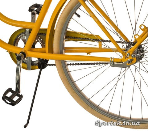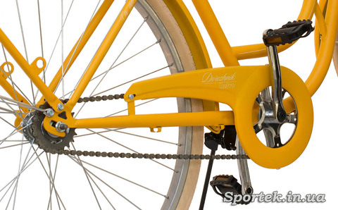 Железная защита цепи убережет брюки и юбки от соприкосновения с цепью и от попадания под зубья звездочки, а саму цепь от излишнего загрязнения.